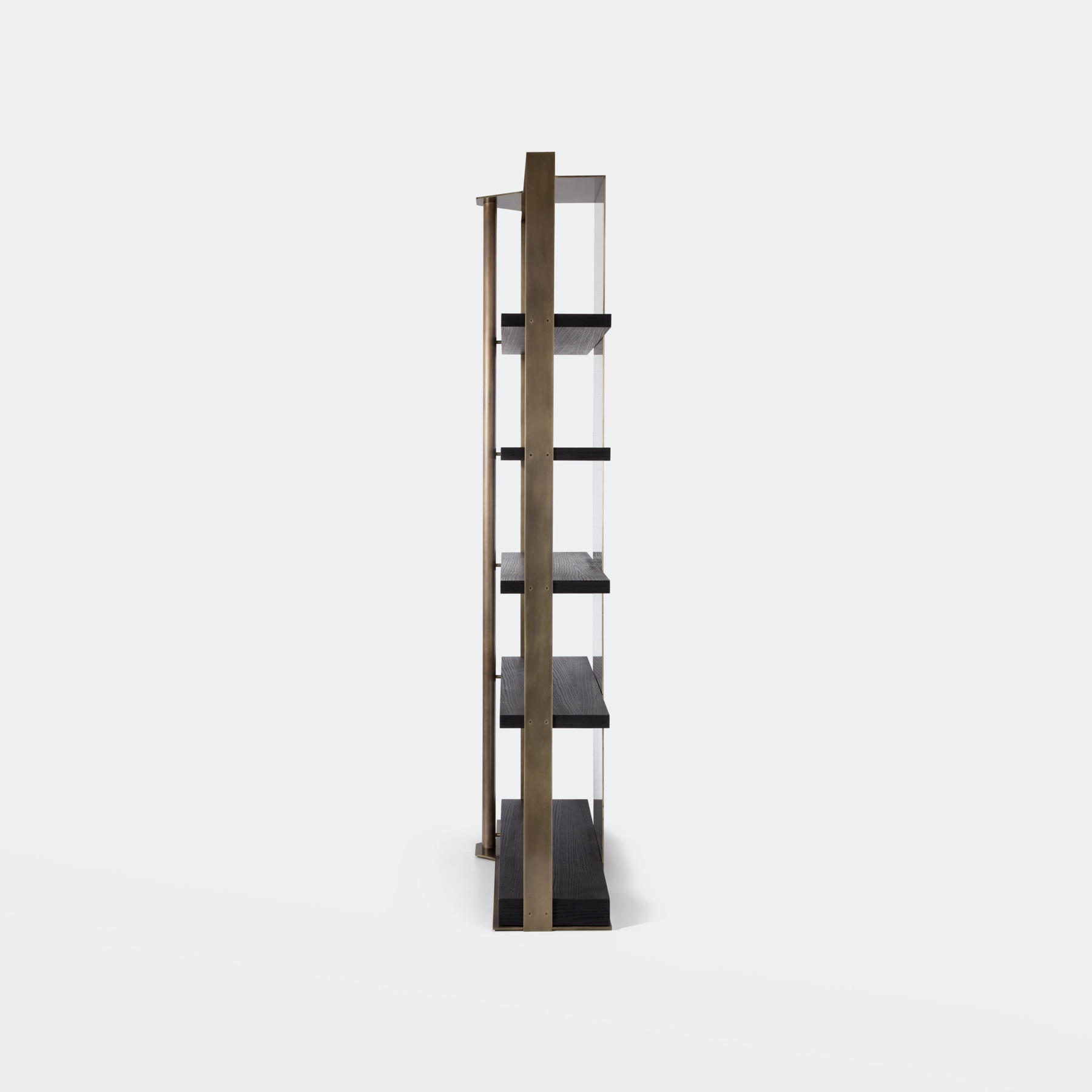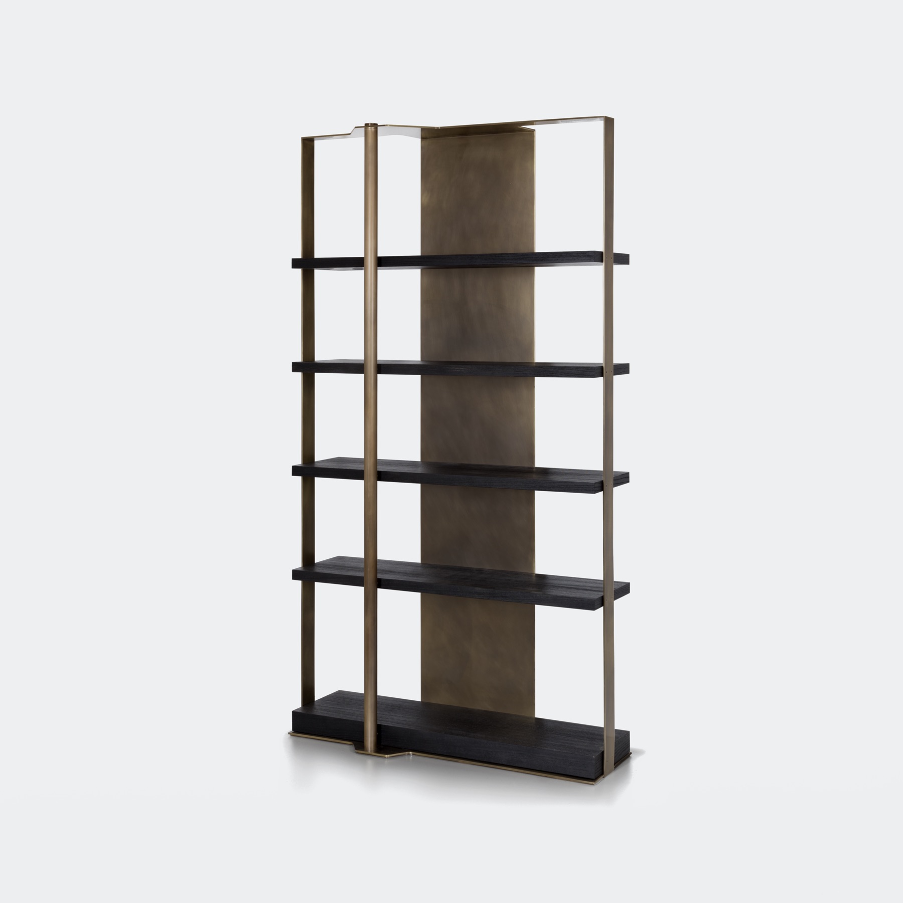 Hand patinated brass and sandblasted oak. Available in one standard size and many custom options, the bookcase mixes subtly luxurious materials in an architectural structure. Meticulous hand application of the patina inside and outside brings depth to the brass frame. Sandblasting the oak shelves gives a contrast to the smoothness of the brass.